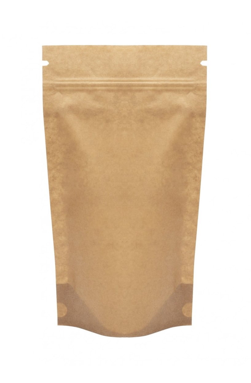 Worek typu doypack pokryty brązowym papierem o pojemności 750ml ze struną umożliwiającą wielokrotne otwieranie i zamykanie oraz nacinką "easy-open", która ułatwia otwieranie po zgrzaniu worka.