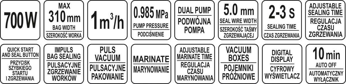 - funkcje pakowania próżniowego automatycznego i pulsacyjnego oraz zgrzewania